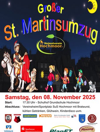 Der St. Martinsumzug des Heimatvereins Hochmoor startet mit geänderter Wegstrecke am Samstag, den 8.11., um 17.30 Uhr auf dem Schulhof der Grundschule in Hochmoor.