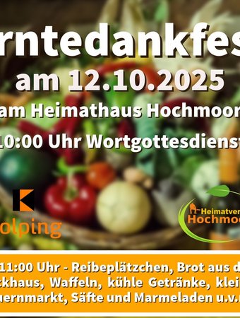 Das Erntedankfest am Heimathaus Hochmoor beginnt um 10 Uhr mit einem Wortgottesdienst der Kirchengemeinde St. Peter und Paul (direkt am Heimathaus). Ab 11 Uhr eröffnet ein kleiner Bauernmarkt mit…
