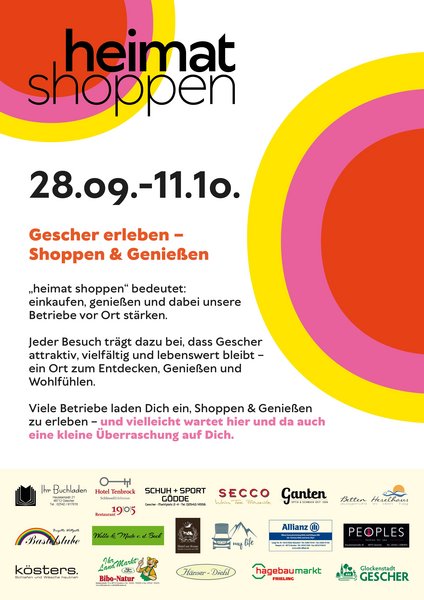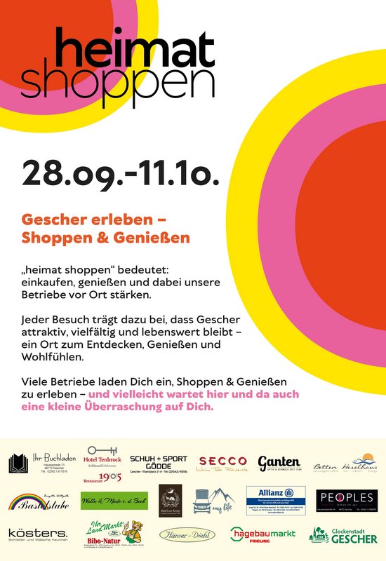 Nutzen Sie die letzten Tage der Aktion „heimat -shoppen“, um beim Bummeln durch unsere Innenstadt die Vielfalt unserer Betriebe, Gastronomen und Dienstleister zu entdecken. Jeder Einkauf vor Ort stärkt unsere Geschäfte, sichert Arbeitsplätze – und hält Gescher lebendig.