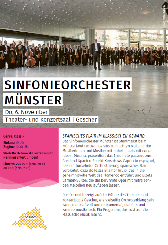 Das Sinfonieorchester Münster ist Stammgast beim Münsterland Festival. Bereits zum achten Mal sind die Musikerinnen und Musiker mit dabei – stets mit neuen Ideen. Diesmal präsentiert das Ensemble passend zum Gastland Spanien Rimski-Korsakows Capriccio espagnol, das mit funkelnder Orchestrierung spanisches Flair verbreitet, dazu de Fallas El amor brujo, das in die geheimnisvolle Welt des Flamenco entführt und Bizets Carmen-Suiten, die die berühmte Oper mit mitreißenden Melodien neu aufleben lassen.