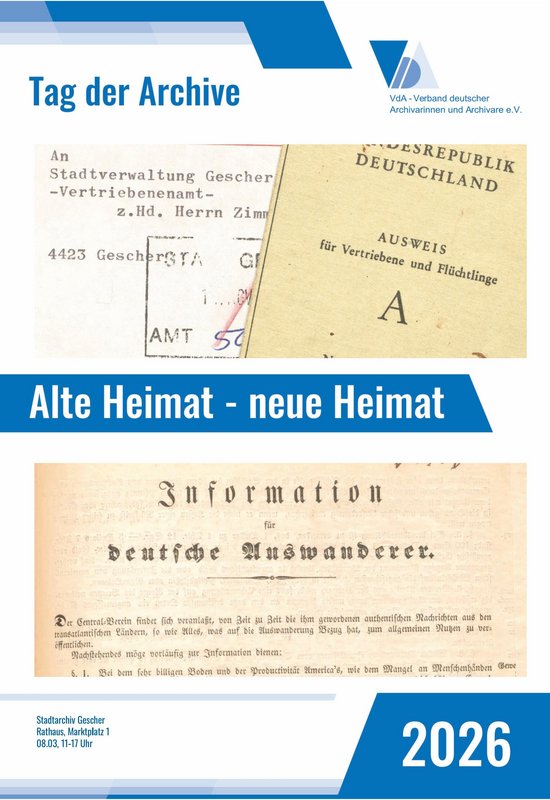 Beim E-Voting haben die Mitglieder des VdA (Verband deutscher Archivarinnen und Archivare e.V.) mit großer Mehrheit für das Motto „Alte Heimat – neue Heimat“ gestimmt. Dieses Thema bietet eine Fülle von Anknüpfungspunkten in unseren Beständen. Archive bergen unzählige Geschichten über Migration, Flucht, Ankommen, Verwurzelung und den Wandel von Gemeinschaften. Es warten spannende Funde über Menschen, die ihre Heimat verlassen mussten oder freiwillig eine neue gesucht haben, über das Bewahren alter Traditionen in der Fremde und das Entstehen neuer Identitäten und Kulturen. Tiefgreifende Geschichten von Ortsveränderungen, etwa die Neugründung von Institutionen wie Universitäten oder die Umsiedlung ganzer Dörfer infolge von Bergbau oder Infrastrukturprojekten, zeigen ebenfalls exemplarisch den Wandel von „alter“ zu „neuer“ Heimat. Dieses Motto erlaubt uns, die tiefgreifenden Prozesse von Wandel, Identität und Integration in unserer Gesellschaft durch die Linse der historischen Überlieferung am Beispiel des Begriffs "Heimat" sichtbar zu machen.